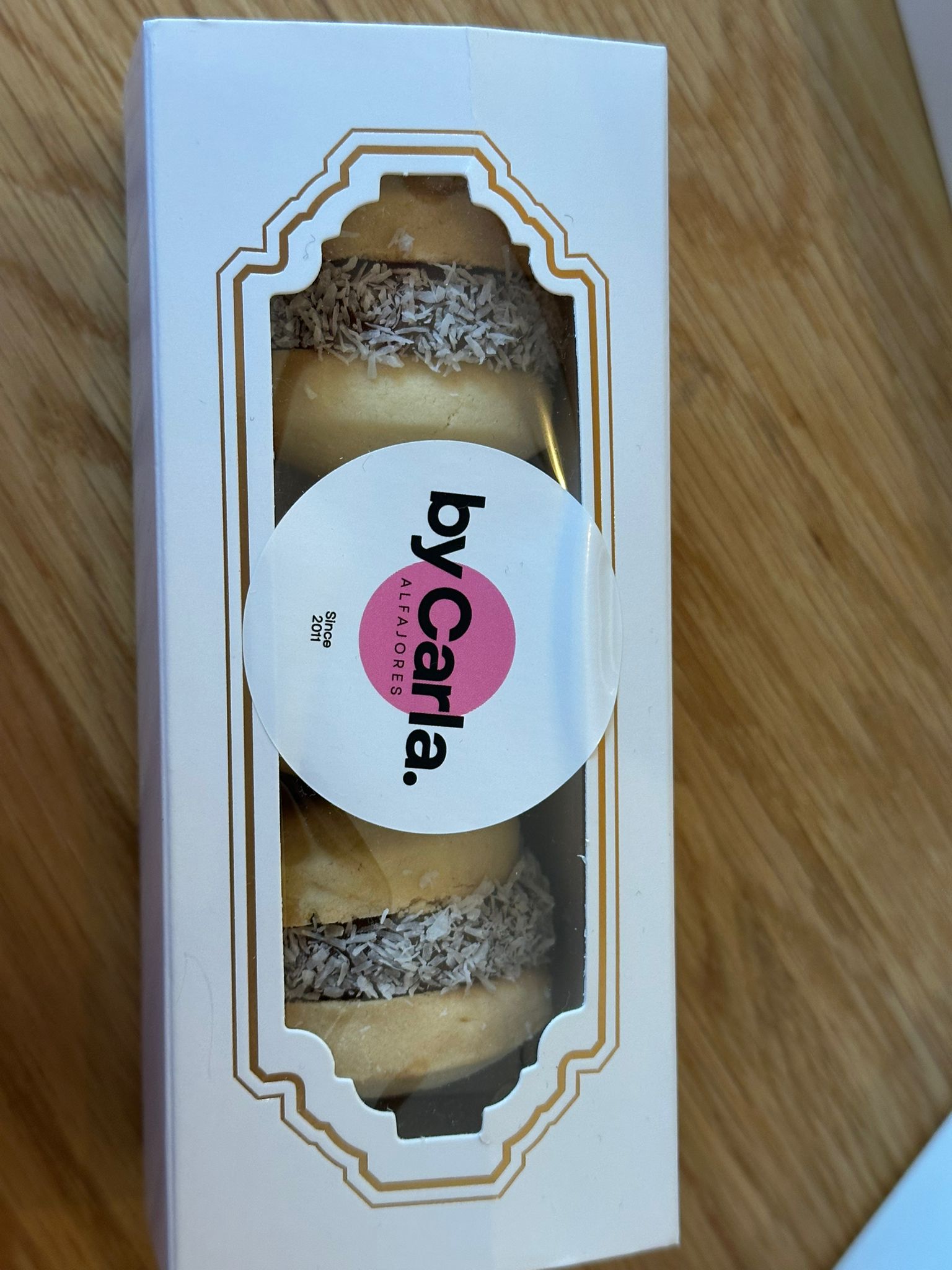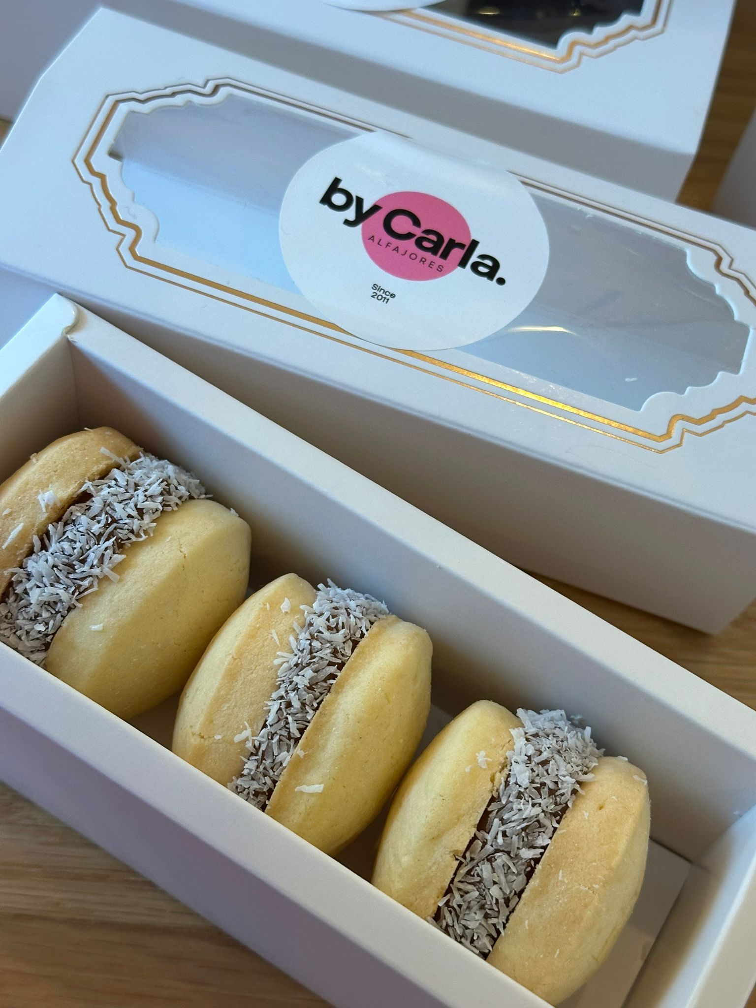 Nuestros infaltables de siempre, en versión mini. Esta cajita incluye 3 mini alfajores de maicena by Carla, rellenos con dulce de leche suave y envueltos en coco rallado.