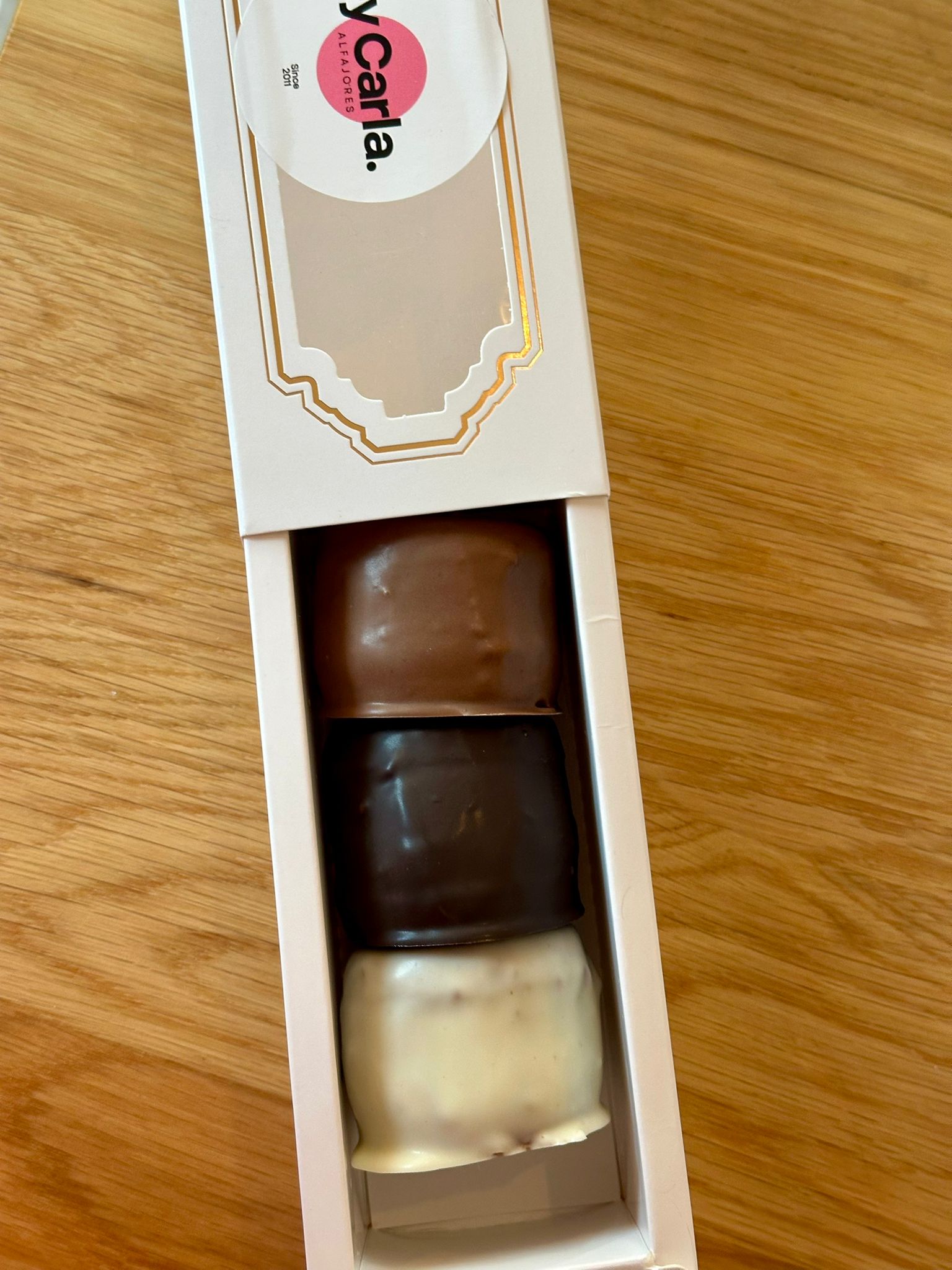 Nuestros clásicos marplatenses, en tamaño mini. Esta cajita incluye 3 mini alfajores marplatenses de chocolate by Carla: uno de chocolate negro, uno de chocolate blanco y uno de chocolate con leche.